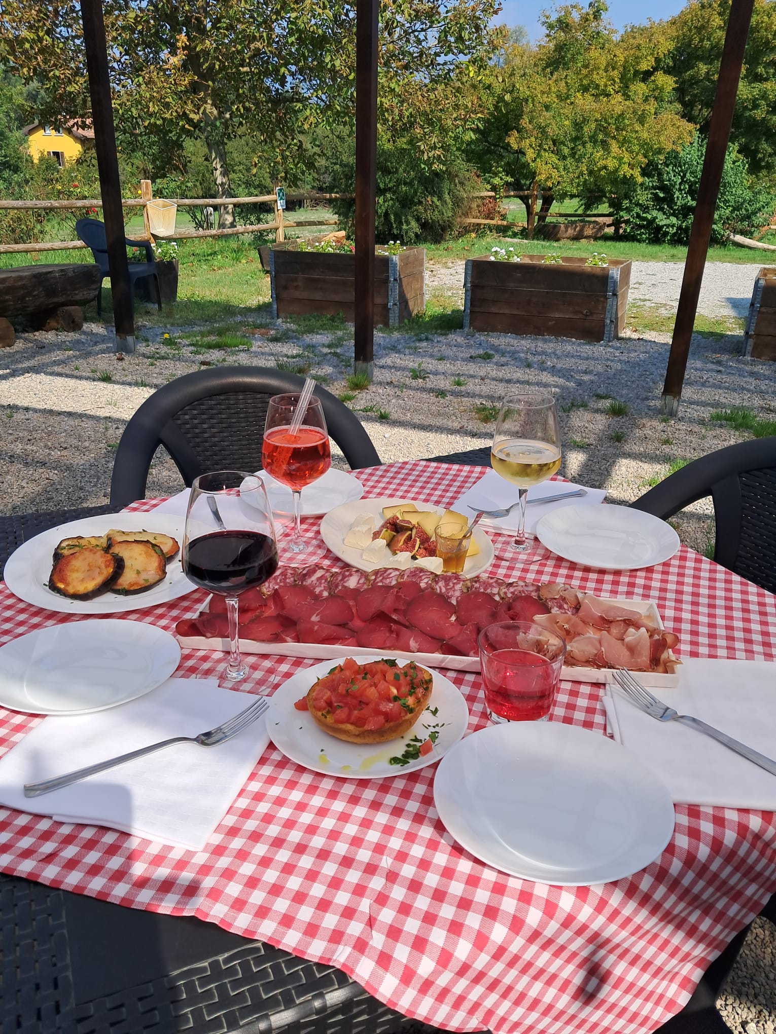 Antipasto con affettati, formaggi, giardiniera, parmigiana di melanzane, pizza e focaccia